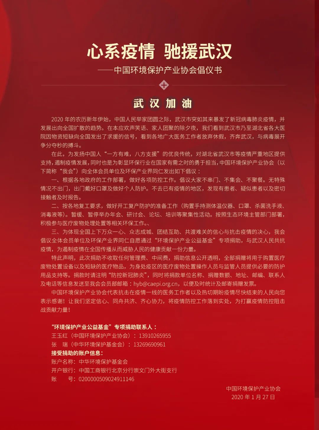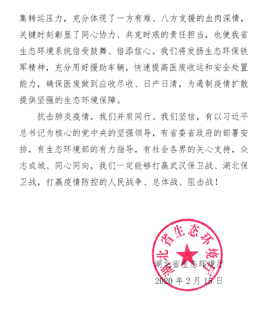 4、1月31日,為發(fā)揚中國人“一方有難,八方支援”的優(yōu)良傳統(tǒng),對湖北省武漢市等疫情嚴(yán)重地區(qū)提供支持,我會向全體會員單位及環(huán)保產(chǎn)業(yè)界同仁發(fā)出發(fā)布 “心系疫情馳援武漢——中國環(huán)境保護(hù)協(xié)會倡議書”,籌集捐款約290萬元,購置65輛醫(yī)廢轉(zhuǎn)運車,支援湖北抗疫。